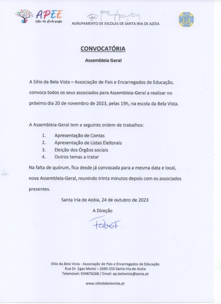 Convocam-se todos os associados para Assembleia Geral a realizar no próximo dia 20 de Novembro, pelas 19h00, nas Escola da Bela Vista. A participação de todos é importante para manter vivo o Sítio da Bela Vista. Apareçam!
